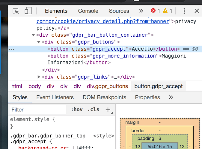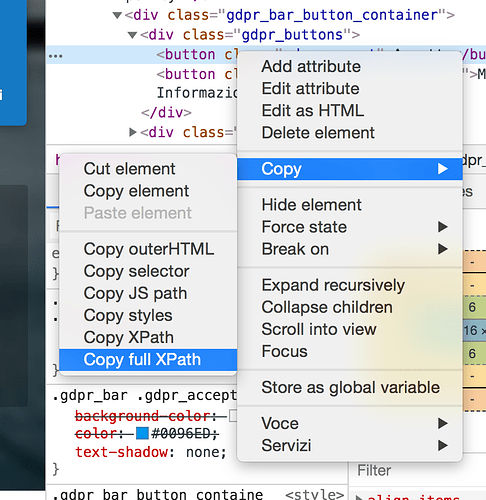 We note that the button associated to cookies corresponds to the class “gdpr_accept”, which corresponds to the relative xpath: //*[@class=’gdpr_accept’]. You can also extract the absolute xpath by selecting the button on the html code and right clicking it. You can now select Copy → Copy full Xpath: /html/body/div[9]/div/div/div[1]/button[1]