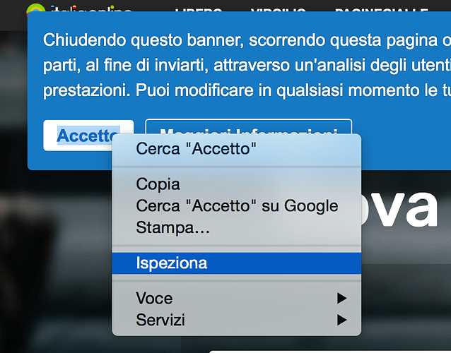 Cookies should be accepted in all the cases when writing a scraper. In order to accept a cookie in the script, firstly we should identify it. Manually open the page of the search engine and select the button corresponding to the cookie with the right button of the mouse. From the menu, we select Inspect and a new page opens.