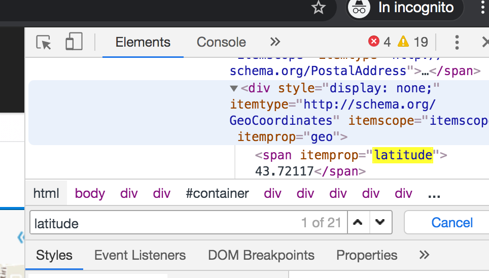 In order to find in which html tag latitude and longitude are located, we can open the html inspector, by right clicking in a generic part of the html page and search for the word “latitude”. We can open the finding window by typing CMD+F or Ctrl+F: